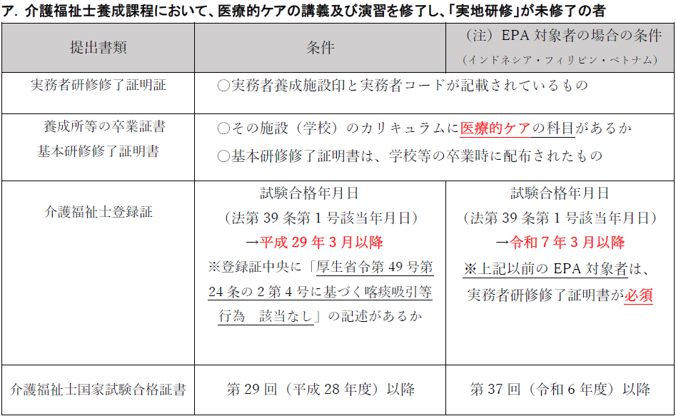 ①介護福祉士養成課程(養成施設、実務者研修、福祉系高校等)において医療的ケアの講義及び演習を 修了し、「実地研修」が未修了の者