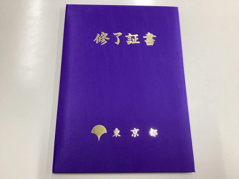 修了証書授与では、東京都福祉保健財団杉村理事長から小池百合子東京都知事名の修了証書を一人ひとりに手渡されました。