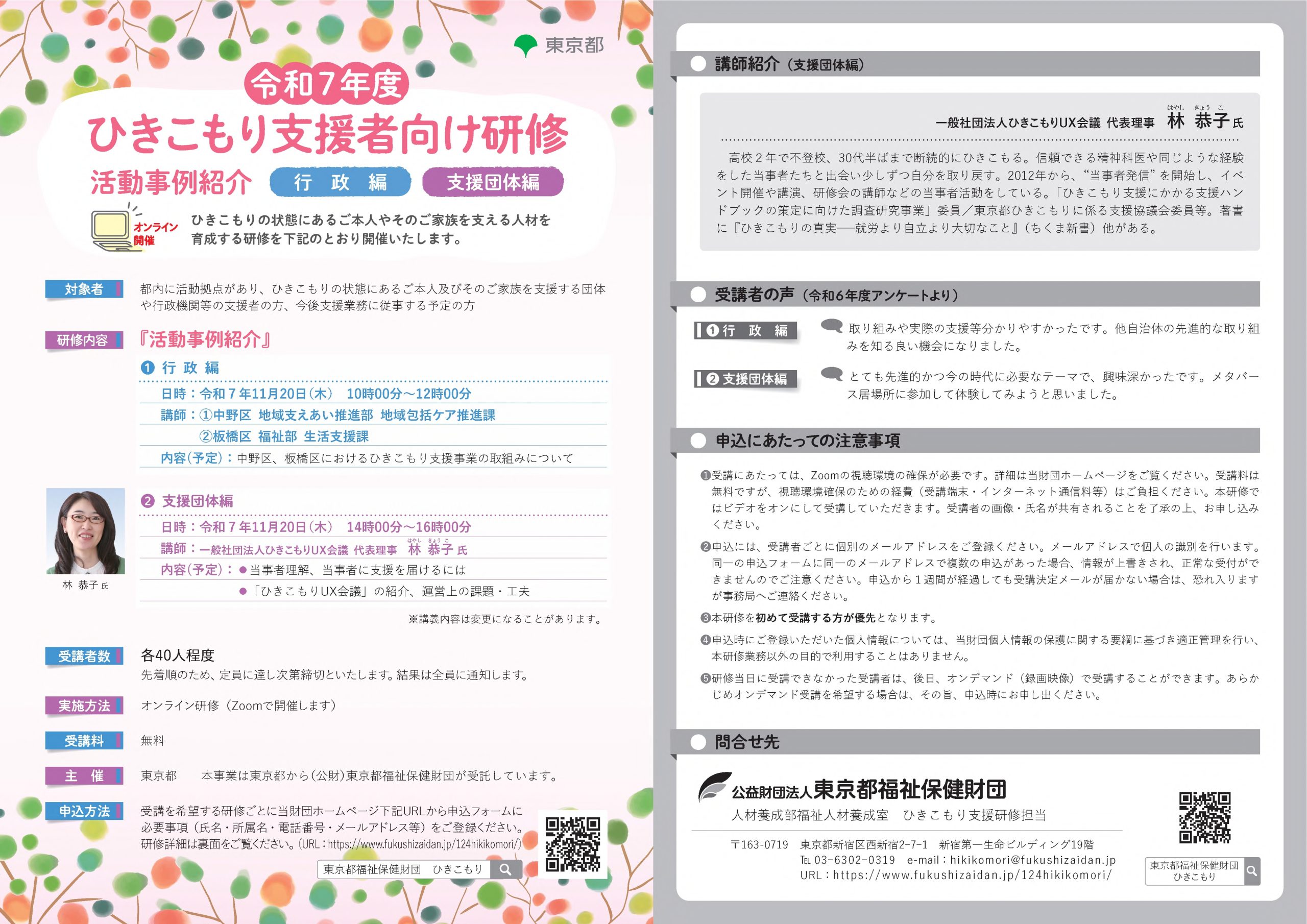 都内に活動拠点があり、ひきこもりの本人やそのご家族を支援する団体や行政機関等の支援者の方、今後支援業務に従事する予定の方、本研修を受講するのが初めての方が優先となります。