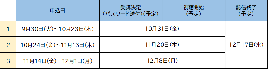 申込日に応じて表のとおり、順次受講できます。視聴できる動画の内容は同じです。